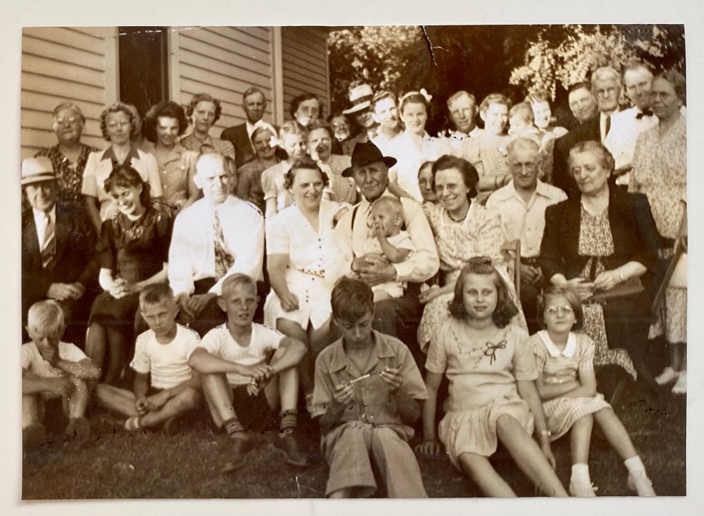 Gus is in the center of the photo wearing a dark hat and holding grandson Burt Johnson. The middle row, left to right: unknown man, Mae Burton, Earl Burton, Florence Burton Johnson, Gus Burton, Burton (Burt) Johnson, Laura Burton, L. Earl Devore, unknown woman. Front row, left to right: Ronald (Ron) Burton, Robert (Bob) Burton, Richard (Dick) Burton, other children unknown. (Photo submitted by Burt Johnson.)