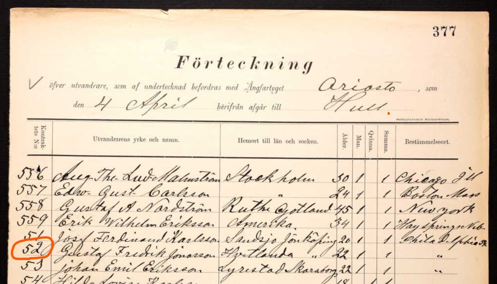 Gus departed Hvetlanda, Jönköping, Sweden on a ship bound for Gothenberg, Sweden on 22 March 1890. He traveled alone. When he arrived in Gothenberg, he boarded the Ariosto, a new ship built that year by Wilson Lines. The Ariosto was a commuter ship that ran between Gothenberg and Hull, England.