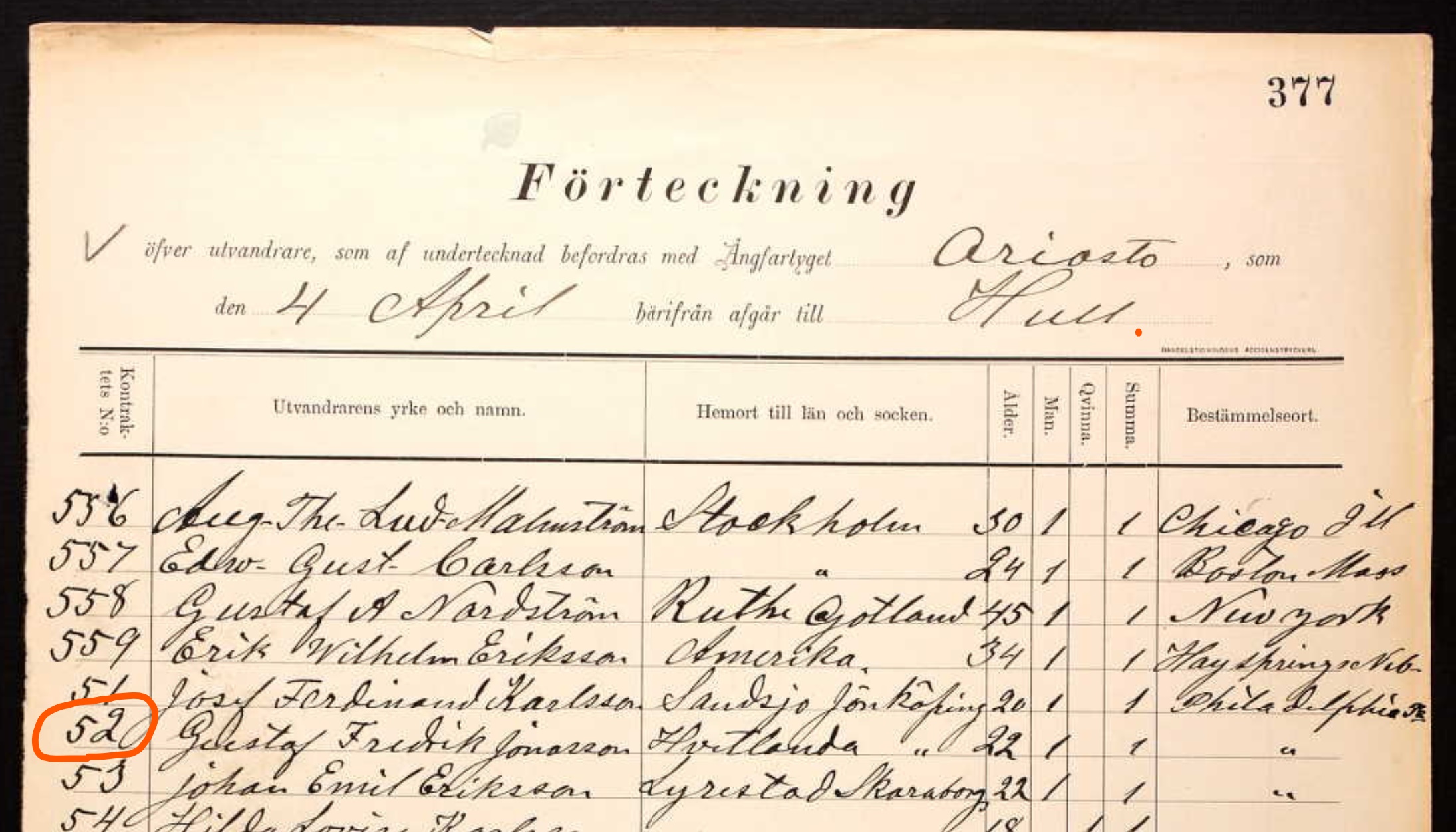 Gus departed Hvetlanda, Jönköping, Sweden on a ship bound for Gothenberg, Sweden on 22 March 1890. He traveled alone. When he arrived in Gothenberg, he boarded the Ariosto, a new ship built that year by Wilson Lines. The Ariosto was a commuter ship that ran between Gothenberg and Hull, England.