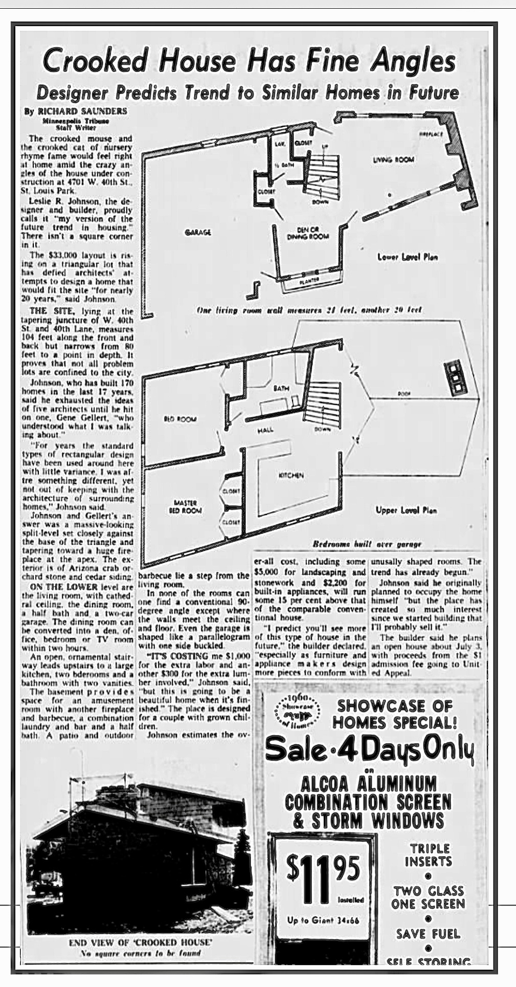 This project was quite a change from the standard little postwar bungalows Leslie had been building for many years, and the challenge encouraged his creativity. He produced a beautiful contemporary home that belied the ‘Crooked Little House’ label and generated a lot of very positive publicity, including a half-page article in the Sunday Star Tribune, May 1960. Grandparents Leslie and Alice Johnson occupied the home for a few years before eventually selling it and moving on to their next adventure.