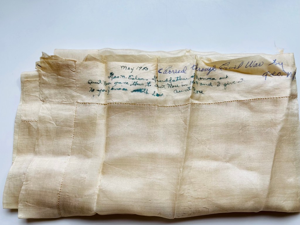 Our family has a treasured token: a white silk handkerchief carried by an ancestor during his service in the Civil War. It’s been passed tenderly from generation to generation of women in our family. In medieval times, a lady’s favor was usually something small that could be tucked away in the knight’s armor as a private symbol of devotion. Much like a medieval knight, Great-Great-Great Grandfather George Nazro Esler carried his lady’s favor, a white silk handkerchief, into war with him and it survives to this day.