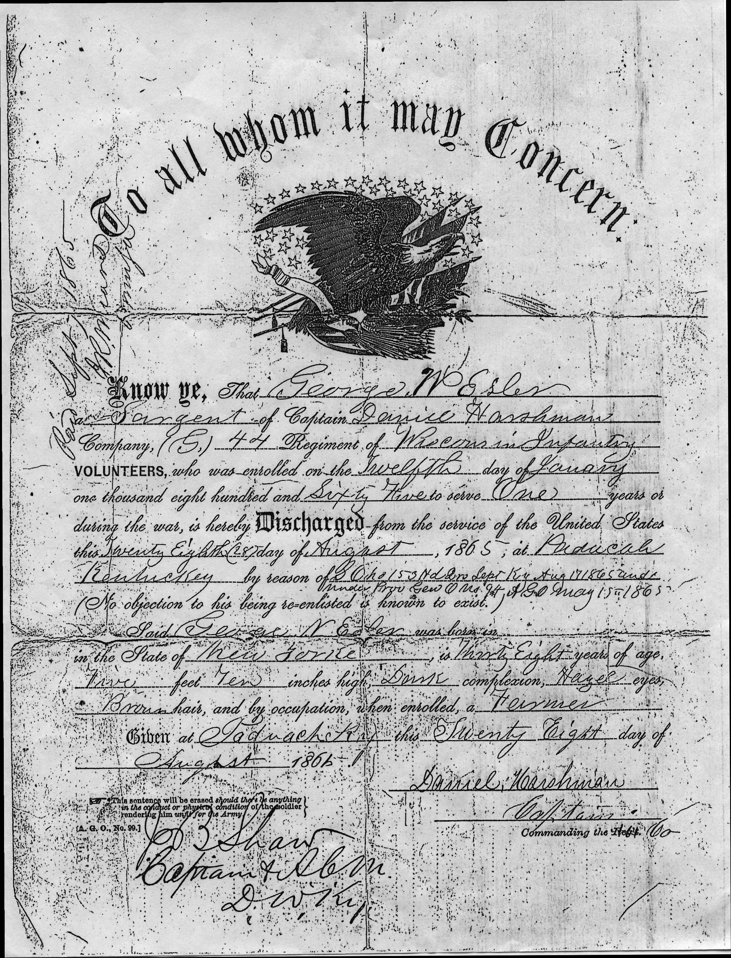 Patriotism, or perhaps adventure, must have called or maybe George needed money to support his growing family, but in 1865, he re-enlisted as a Sergeant with the Wisconsin 44th Infantry, Company G. He served a one-year term and returned safely home after his enlistment period ended. By that time, the Civil War had ended and George Nazro Esler was 33 years old, although his discharge papers say he was 38.